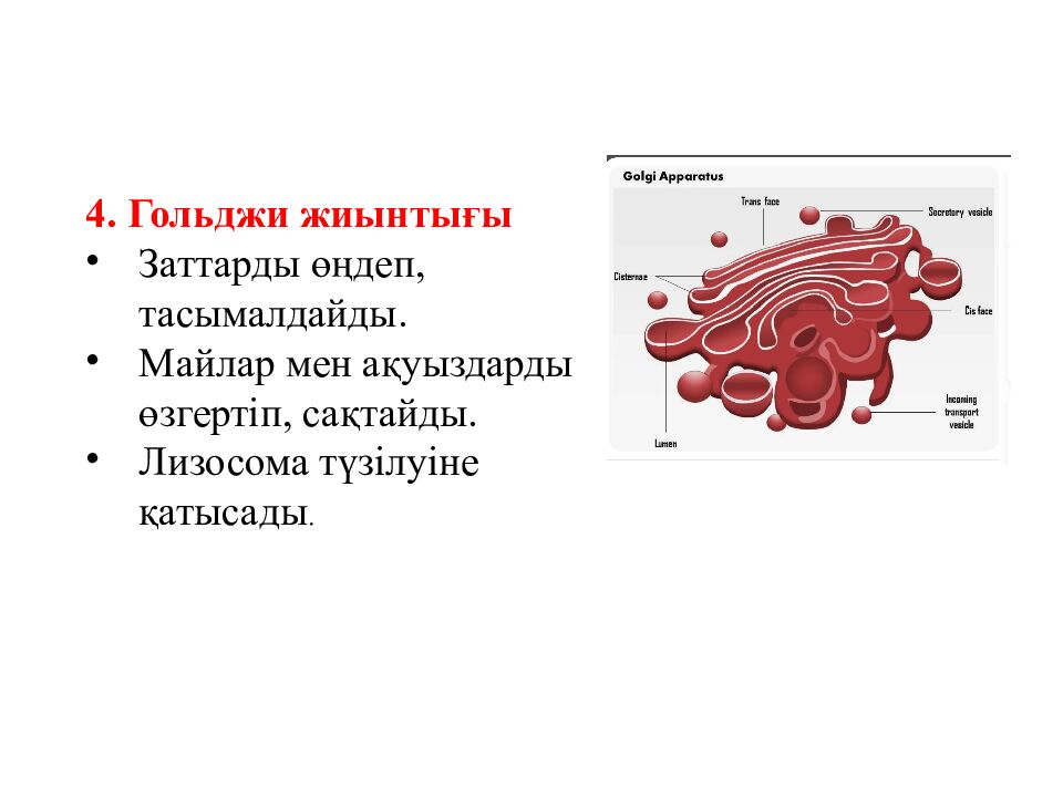 4. Гольджи жиынтығы Заттарды өңдеп, тасымалдайды. Майлар мен ақуыздарды өзгертіп, сақтайды. Лизосома түзілуіне қатысады.