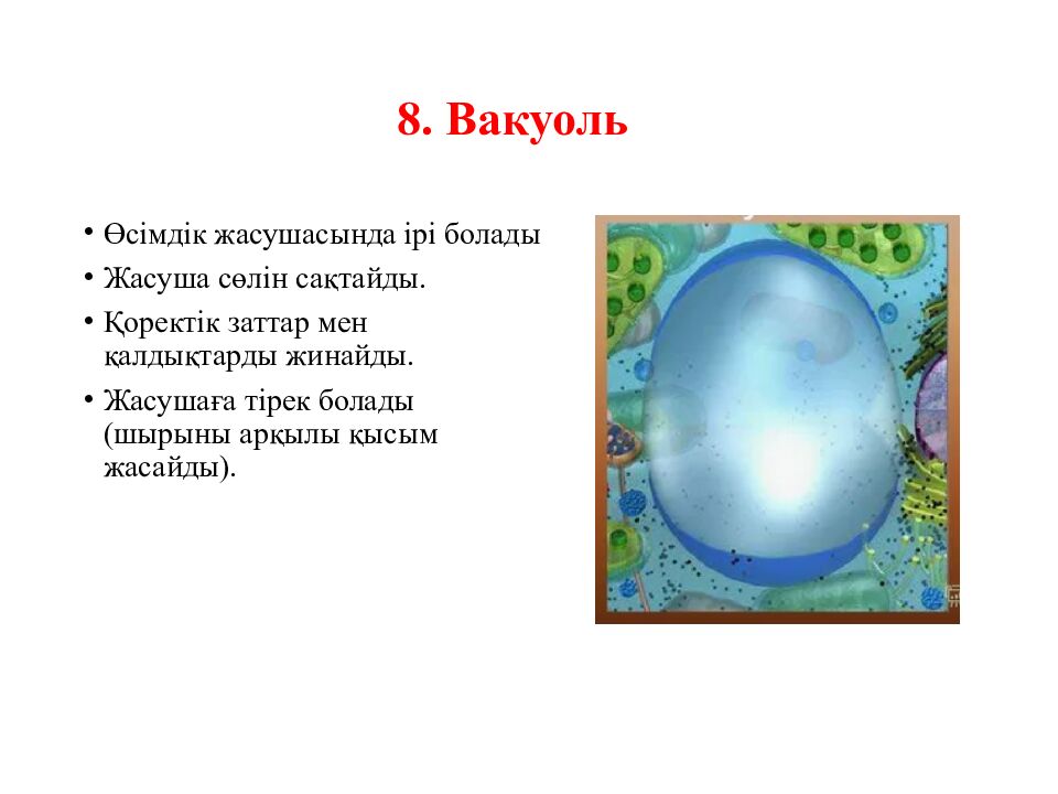 Өсімдік жасушасында ірі болады Жасуша сөлін сақтайды. Қоректік заттар мен қалдықтарды жинайды. Жасушаға тірек болады ( шырыны арқылы қысым жасайды ).