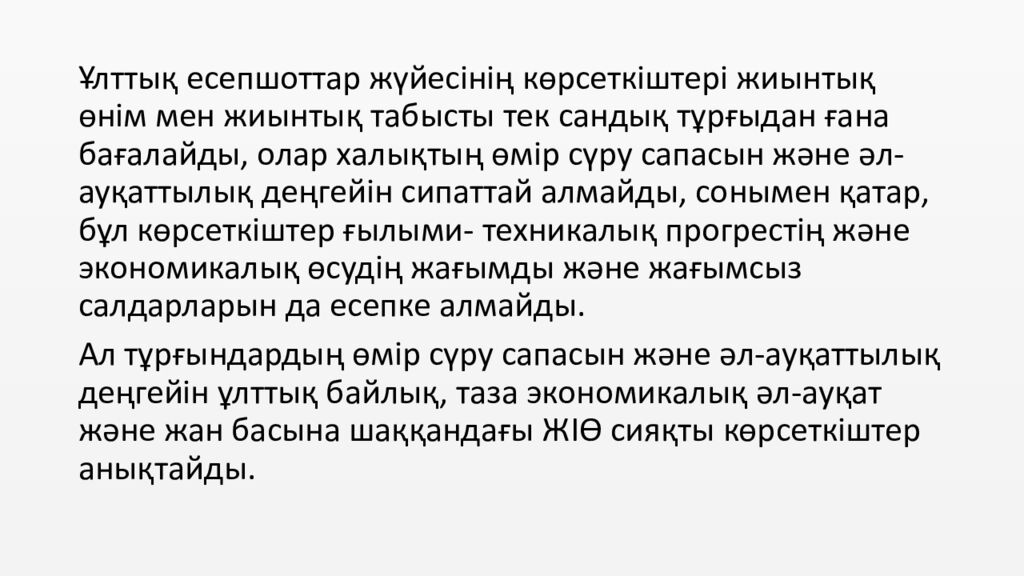 Ұлттық есепшоттар жүйесінің көрсеткіштері жиынтық өнім мен жиынтық табысты тек сандық тұрғыдан ғана бағалайды, олар халықтың өмір сүру сапасын жəне əл-ауқаттылық деңгейін сипаттай алмайды, сонымен қатар, бұл көрсеткіштер ғылыми- техникалық прогрестің жəне экономикалық өсудің жағымды жəне жағымсыз салдарларын да есепке алмайды. Ал тұрғындардың өмір сүру сапасын жəне əл-ауқаттылық деңгейін ұлттық байлық, таза экономикалық əл-ауқат жəне жан басына шаққандағы ЖІӨ сияқты көрсеткіштер анықтайды.