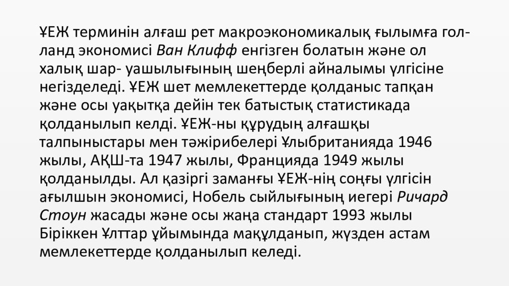 ҰЕЖ терминін алғаш рет макроэкономикалық ғылымға гол- ланд экономисі Ван Клифф енгізген болатын жəне ол халық шар- уашылығының шеңберлі айналымы үлгісіне негізделеді. ҰЕЖ шет мемлекеттерде қолданыс тапқан жəне осы уақытқа дейін тек батыстық статистикада қолданылып келді. ҰЕЖ-ны құрудың алғашқы талпыныстары мен тəжірибелері Ұлыбританияда 1946 жылы, АҚШ-та 1947 жылы, Францияда 1949 жылы қолданылды. Ал қазіргі заманғы ҰЕЖ-нің соңғы үлгісін ағылшын экономисі, Нобель сыйлығының иегері Ричард Стоун жасады жəне осы жаңа стандарт 1993 жылы Біріккен Ұлттар ұйымында мақұлданып, жүзден астам мемлекеттерде қолданылып келеді.