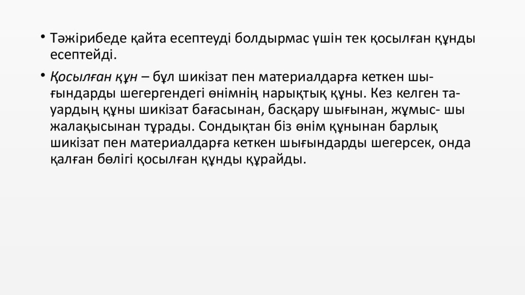 Тəжірибеде қайта есептеуді болдырмас үшін тек қосылған құнды есептейді. Қосылған құн – бұл шикізат пен материалдарға кеткен шы- ғындарды шегергендегі өнімнің нарықтық құны. Кез келген та- уардың құны шикізат бағасынан, басқару шығынан, жұмыс- шы жалақысынан тұрады. Сондықтан біз өнім құнынан барлық шикізат пен материалдарға кеткен шығындарды шегерсек, онда қалған бөлігі қосылған құнды құрайды.