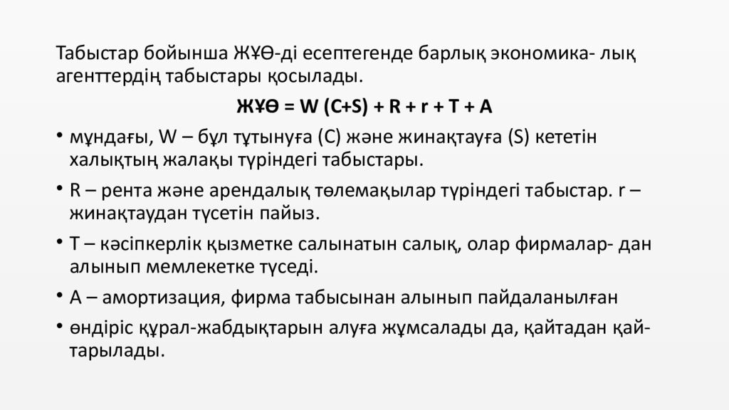 Табыстар бойынша ЖҰӨ-ді есептегенде барлық экономика- лық агенттердің табыстары қосылады. ЖҰӨ = W (C+S) + R + r + T + A мұндағы, W – бұл тұтынуға (С) жəне жинақтауға (S) кететін халықтың жалақы түріндегі табыстары. R – рента жəне арендалық төлемақылар түріндегі табыстар. r – жинақтаудан түсетін пайыз. T – кəсіпкерлік қызметке салынатын салық, олар фирмалар- дан алынып мемлекетке түседі. A – амортизация, фирма табысынан алынып пайдаланылған өндіріс құрал-жабдықтарын алуға жұмсалады да, қайтадан қай- тарылады.