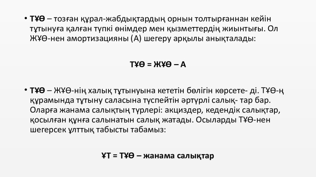 ТҰӨ – тозған құрал-жабдықтардың орнын толтырғаннан кейін тұтынуға қалған түпкі өнімдер мен қызметтердің жиынтығы. Ол ЖҰӨ-нен амортизацияны (А) шегеру арқылы анықталады: ТҰӨ = ЖҰӨ – А ТҰӨ – ЖҰӨ-нің халық тұтынуына кететін бөлігін көрсете- ді. ТҰӨ-ң құрамында тұтыну саласына түспейтін əртүрлі салық- тар бар. Оларға жанама салықтың түрлері: акциздер, кедендік салықтар, қосылған құнға салынатын салық жатады. Осыларды ТҰӨ-нен шегерсек ұлттық табысты табамыз: ҰТ = ТҰӨ – жанама салықтар