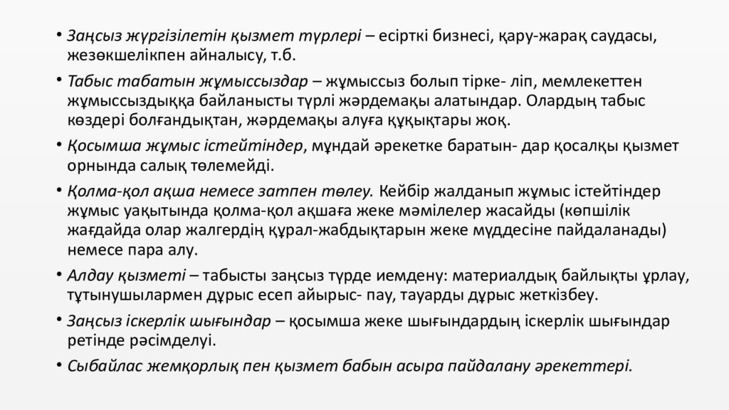 Заңсыз жүргізілетін қызмет түрлері – есірткі бизнесі, қару-жарақ саудасы, жезөкшелікпен айналысу, т.б. Табыс табатын жұмыссыздар – жұмыссыз болып тірке- ліп, мемлекеттен жұмыссыздыққа байланысты түрлі жəрдемақы алатындар. Олардың табыс көздері болғандықтан, жəрдемақы алуға құқықтары жоқ. Қосымша жұмыс істейтіндер, мұндай əрекетке баратын- дар қосалқы қызмет орнында салық төлемейді. Қолма-қол ақша немесе затпен төлеу. Кейбір жалданып жұмыс істейтіндер жұмыс уақытында қолма-қол ақшаға жеке мəмілелер жасайды (көпшілік жағдайда олар жалгердің құрал-жабдықтарын жеке мүддесіне пайдаланады) немесе пара алу. Алдау қызметі – табысты заңсыз түрде иемдену: материалдық байлықты ұрлау, тұтынушылармен дұрыс есеп айырыс- пау, тауарды дұрыс жеткізбеу. Заңсыз іскерлік шығындар – қосымша жеке шығындардың іскерлік шығындар ретінде рəсімделуі. Сыбайлас жемқорлық пен қызмет бабын асыра пайдалану əрекеттері.
