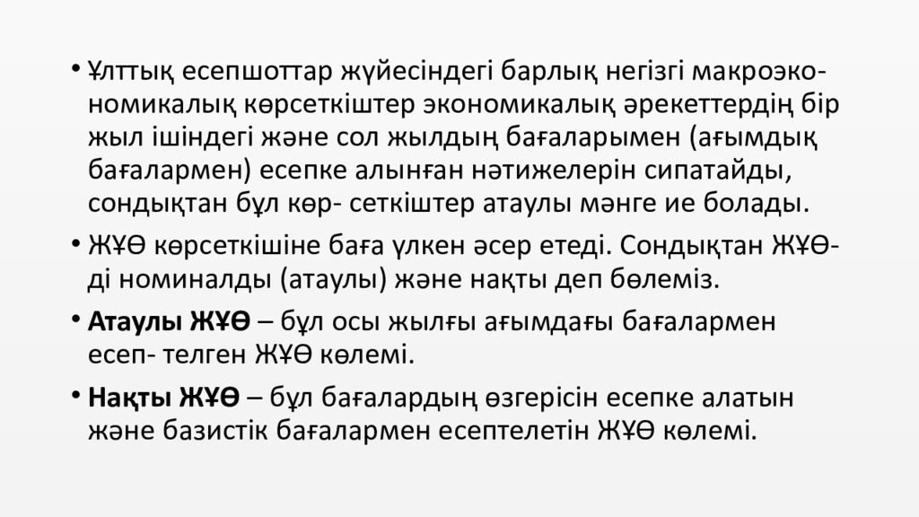 Ұлттық есепшоттар жүйесіндегі барлық негізгі макроэко- номикалық көрсеткіштер экономикалық əрекеттердің бір жыл ішіндегі жəне сол жылдың бағаларымен (ағымдық бағалармен) есепке алынған нəтижелерін сипатайды, сондықтан бұл көр- сеткіштер атаулы мəнге ие болады. ЖҰӨ көрсеткішіне баға үлкен əсер етеді. Сондықтан ЖҰӨ-ді номиналды (атаулы) жəне нақты деп бөлеміз. Атаулы ЖҰӨ – бұл осы жылғы ағымдағы бағалармен есеп- телген ЖҰӨ көлемі. Нақты ЖҰӨ – бұл бағалардың өзгерісін есепке алатын жəне базистік бағалармен есептелетін ЖҰӨ көлемі.