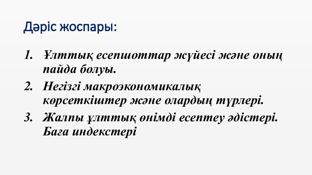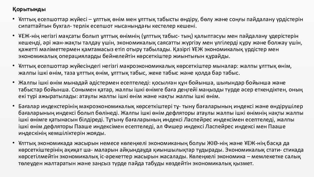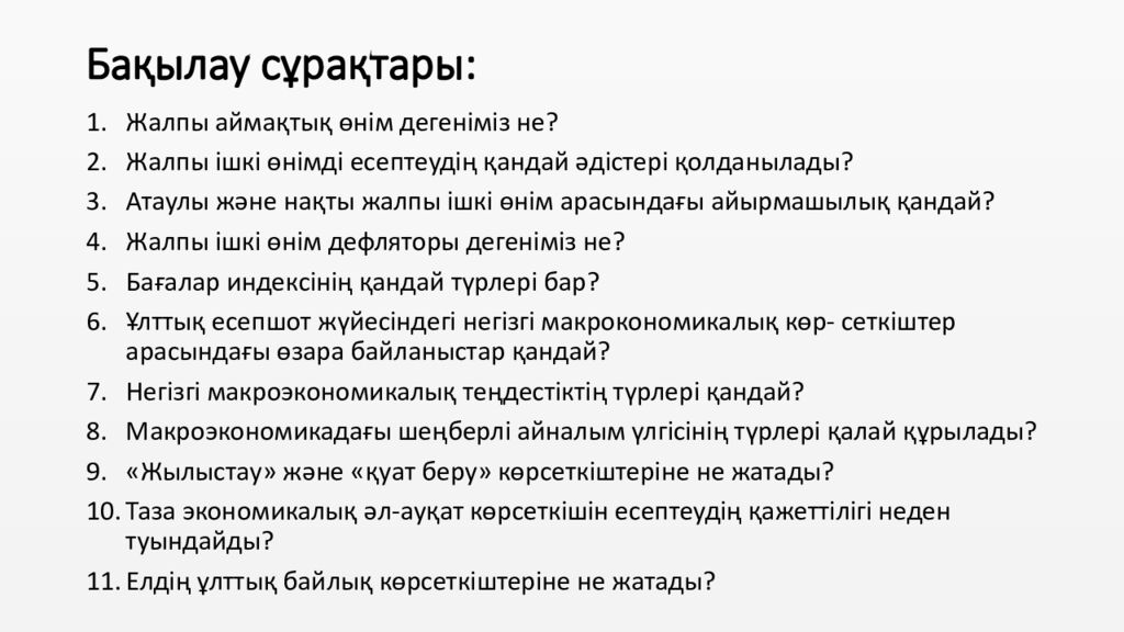 Последний слайд презентации: 2 тақырып. ҰЛТТЫҚ ЕСЕПШОТТАР ЖҮЙЕСІ. НЕГІЗГІ МАКРОЭКОНОМИКАЛЫҚ КӨРСЕТКІШТЕР: Бақылау сұрақтары:
