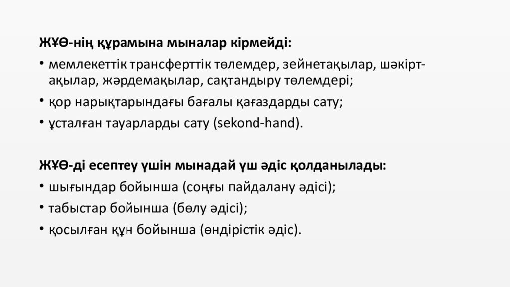 ЖҰӨ-нің құрамына мыналар кірмейді: мемлекеттік трансферттік төлемдер, зейнетақылар, шəкірт- ақылар, жəрдемақылар, сақтандыру төлемдері; қор нарықтарындағы бағалы қағаздарды сату; ұсталған тауарларды сату (sekond-hand). ЖҰӨ-ді есептеу үшін мынадай үш əдіс қолданылады: шығындар бойынша (соңғы пайдалану əдісі); табыстар бойынша (бөлу əдісі); қосылған құн бойынша (өндірістік əдіс).