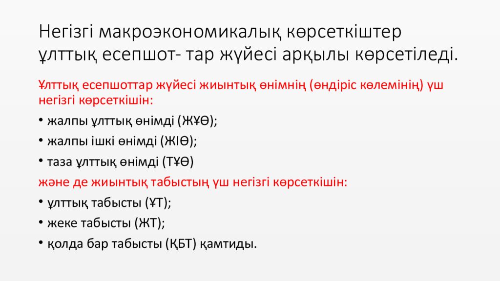 Ұлттық есепшоттар жүйесі жиынтық өнімнің (өндіріс көлемінің ) үш негізгі көрсеткішін: жалпы ұлттық өнімді (ЖҰӨ); жалпы ішкі өнімді (ЖІӨ); таза ұлттық өнімді (ТҰӨ) жəне де жиынтық табыстың үш негізгі көрсеткішін: ұлттық табысты (ҰТ); жеке табысты (ЖТ); қолда бар табысты (ҚБТ) қамтиды.