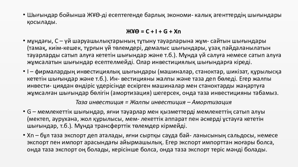 Шығындар бойынша ЖҰӨ-ді есептегенде барлық экономи- калық агенттердің шығындары қосылады. ЖҰӨ = C + I + G + Xn мұндағы, С – үй шаруашылықтарының тұтыну тауарларына жұм- сайтын шығындары (тамақ, киім-кешек, тұрғын үй төлемдері, демалыс шығындары, ұзақ пайдаланылатын тауарларды сатып алуға кететін шығындар жəне т.б.). Мұнда үй салуға немесе сатып алуға жұмсалатын шығындар есептелмейді. Олар инвестициялық шығындарға кіреді. I – фирмалардың инвестициялық шығындары (машиналар, станоктар, шикізат, құрылысқа кететін шығындар жəне т.б.). Ин- вестицияны жалпы жəне таза деп бөледі. Егер жалпы инвести- циядан өндіріс үдерісінде ескірген машиналар мен станоктарды жаңартуға жұмсалған шығындар бөлігін (амортизация) шегерсек, онда таза инвестицияны табамыз. Таза инвестиция = Жалпы инвестиция – Амортизация G – мемлекеттік шығындар, яғни тауарлар мен қызметтерді мемлекеттің сатып алуы (мектеп, аурухана, жол құрылысы, мем- лекеттік аппарат пен əскерді ұстауға кететін шығындар, т.б.). Мұнда трансферттік төлемдер кірмейді. Xn – бұл таза экспорт деп аталады, яғни сыртқы сауда бай- ланысының сальдосы, немесе экспорт пен импорт арасындағы айырмашылық. Егер экспорт импорттан жоғары болса, онда таза экспорт оң болады, керісінше болса, онда таза экспорт теріс мəнді болады.