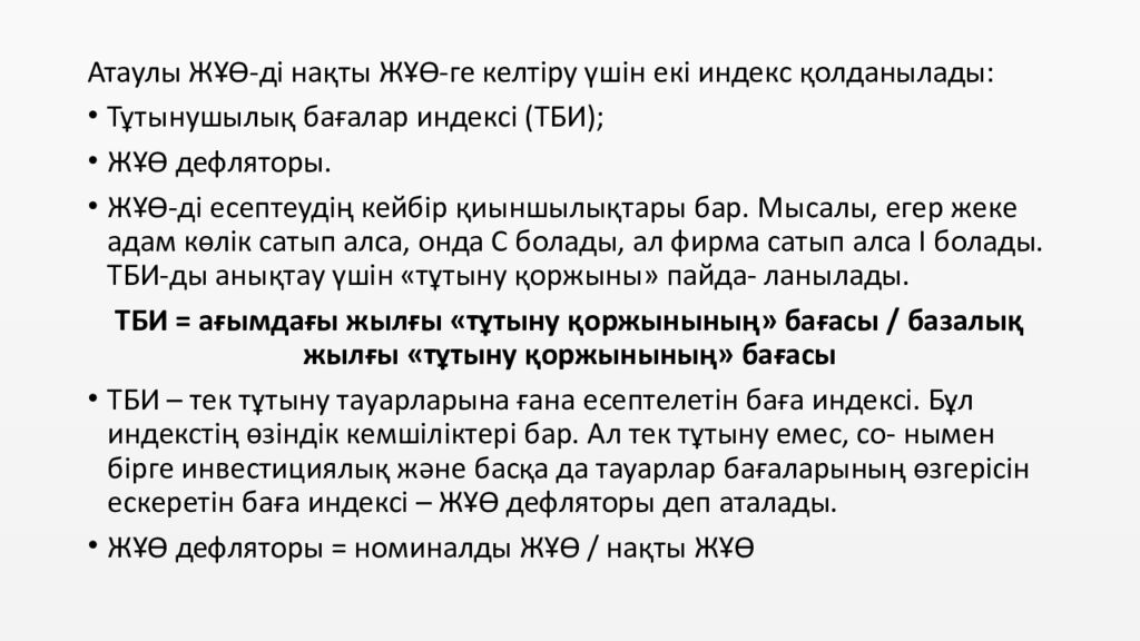 Атаулы ЖҰӨ-ді нақты ЖҰӨ-ге келтіру үшін екі индекс қолданылады: Тұтынушылық бағалар индексі (ТБИ); ЖҰӨ дефляторы. ЖҰӨ-ді есептеудің кейбір қиыншылықтары бар. Мысалы, егер жеке адам көлік сатып алса, онда С болады, ал фирма сатып алса І болады. ТБИ-ды анықтау үшін «тұтыну қоржыны» пайда- ланылады. ТБИ = ағымдағы жылғы «тұтыну қоржынының» бағасы / базалық жылғы «тұтыну қоржынының» бағасы ТБИ – тек тұтыну тауарларына ғана есептелетін баға индексі. Бұл индекстің өзіндік кемшіліктері бар. Ал тек тұтыну емес, со- нымен бірге инвестициялық жəне басқа да тауарлар бағаларының өзгерісін ескеретін баға индексі – ЖҰӨ дефляторы деп аталады. ЖҰӨ дефляторы = номиналды ЖҰӨ / нақты ЖҰӨ