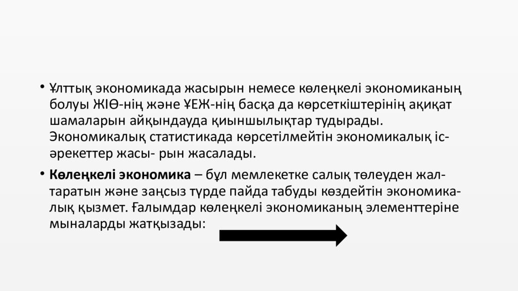 Ұлттық экономикада жасырын немесе көлеңкелі экономиканың болуы ЖІӨ-нің жəне ҰЕЖ-нің басқа да көрсеткіштерінің ақиқат шамаларын айқындауда қиыншылықтар тудырады. Экономикалық статистикада көрсетілмейтін экономикалық іс-əрекеттер жасы- рын жасалады. Көлеңкелі экономика – бұл мемлекетке салық төлеуден жал- таратын жəне заңсыз түрде пайда табуды көздейтін экономика- лық қызмет. Ғалымдар көлеңкелі экономиканың элементтеріне мыналарды жатқызады :