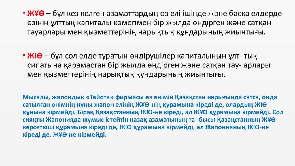 ЖҰӨ – бұл кез келген азаматтардың өз елі ішінде жəне басқа елдерде өзінің ұлттық капиталы көмегімен бір жылда өндірген жəне сатқан тауарлары мен қызметтерінің нарықтық құндарының жиынтығы. ЖІӨ – бұл сол елде тұратын өндірушілер капиталының ұлт- тық сипатына қарамастан бір жылда өндірген жəне сатқан тау- арлары мен қызметтерінің нарықтық құндарының жиынтығы. Мысалы, жапондық «Тайота» фирмасы өз өнімін Қазақстан нарығында сатса, онда сатылған өнімнің құны жапон елінің ЖҰӨ-нің құрамына кіреді де, олардың ЖІӨ құнына кірмейді. Бірақ Қазақстанның ЖІӨ-не кіреді, ал ЖҰӨ құрамына кірмейді. Сол сияқты Жапонияда жұмыс істейтін қазақ азаматының та- бысы Қазақстанның ЖҰӨ көрсеткіші құрамына кіреді де, ЖІӨ құрамына кірмейді, ал Жапонияның ЖІӨ-не кіреді де, ЖҰӨ-не кірмейді.