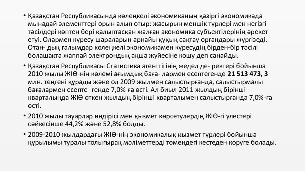 Қазақстан Республикасында көлеңкелі экономиканың қазіргі экономикада мынадай элементтері орын алып отыр: жасырын меншік түрлері мен негізгі тəсілдері көптен бері қалыптасқан жалған экономика субъектілерінің əрекет етуі. Олармен күресу шараларын арнайы құқық сақтау органдары жүргізеді. Отан- дық ғалымдар көлеңкелі экономикамен күресудің бірден-бір тəсілі болашақта жаппай электрондық ақша жүйесіне көшу деп санайды. Қазақстан Республикасы Статистика агенттігінің жедел де- ректері бойынша 2010 жылы ЖІӨ-нің көлемі ағымдық баға- лармен есептегенде 21 513 473, 3 млн. теңгені құрады жəне ол 2009 жылмен салыстырғанда, салыстырмалы бағалармен есепте- генде 7,0%-ға өсті. Ал биыл 2011 жылдың бірінші кварталында ЖІӨ өткен жылдың бірінші кварталымен салыстырғанда 7,0%-ға өсті. 2010 жылы тауарлар өндірісі мен қызмет көрсетулердің ЖІӨ-гі үлестері сəйкесінше 44,2% жəне 52,8% болды. 2009-2010 жылдардағы ЖІӨ-нің экономикалық қызмет түрлері бойынша құрылымы туралы толығырақ мəліметтерді төмендегі кестеден көруге болады.