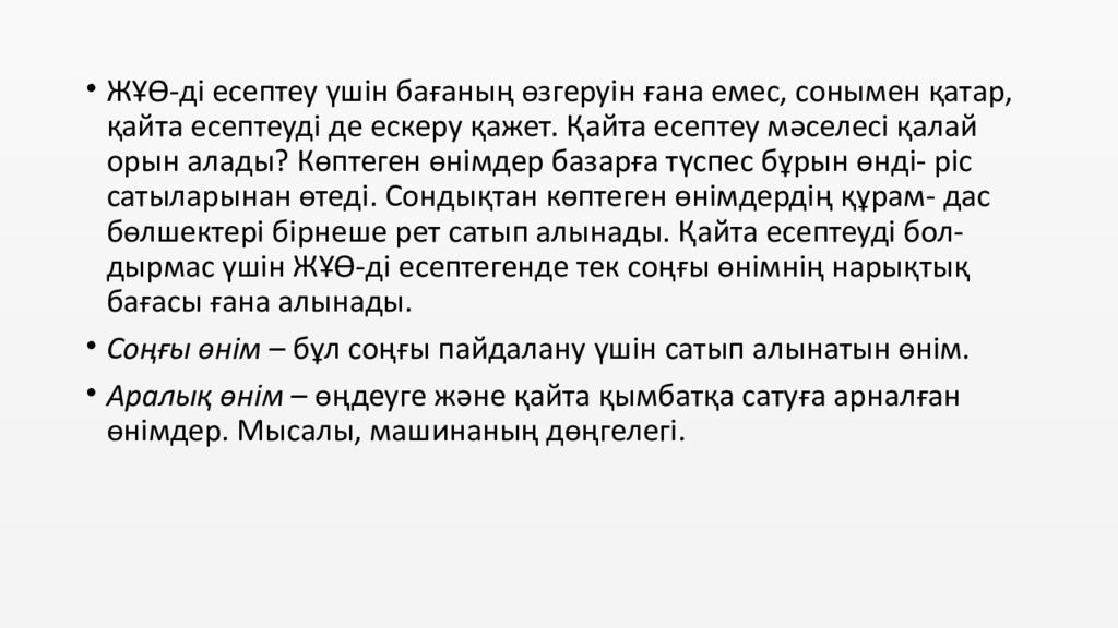 ЖҰӨ-ді есептеу үшін бағаның өзгеруін ғана емес, сонымен қатар, қайта есептеуді де ескеру қажет. Қайта есептеу мəселесі қалай орын алады? Көптеген өнімдер базарға түспес бұрын өнді- ріс сатыларынан өтеді. Сондықтан көптеген өнімдердің құрам- дас бөлшектері бірнеше рет сатып алынады. Қайта есептеуді бол- дырмас үшін ЖҰӨ-ді есептегенде тек соңғы өнімнің нарықтық бағасы ғана алынады. Соңғы өнім – бұл соңғы пайдалану үшін сатып алынатын өнім. Аралық өнім – өңдеуге жəне қайта қымбатқа сатуға арналған өнімдер. Мысалы, машинаның дөңгелегі.