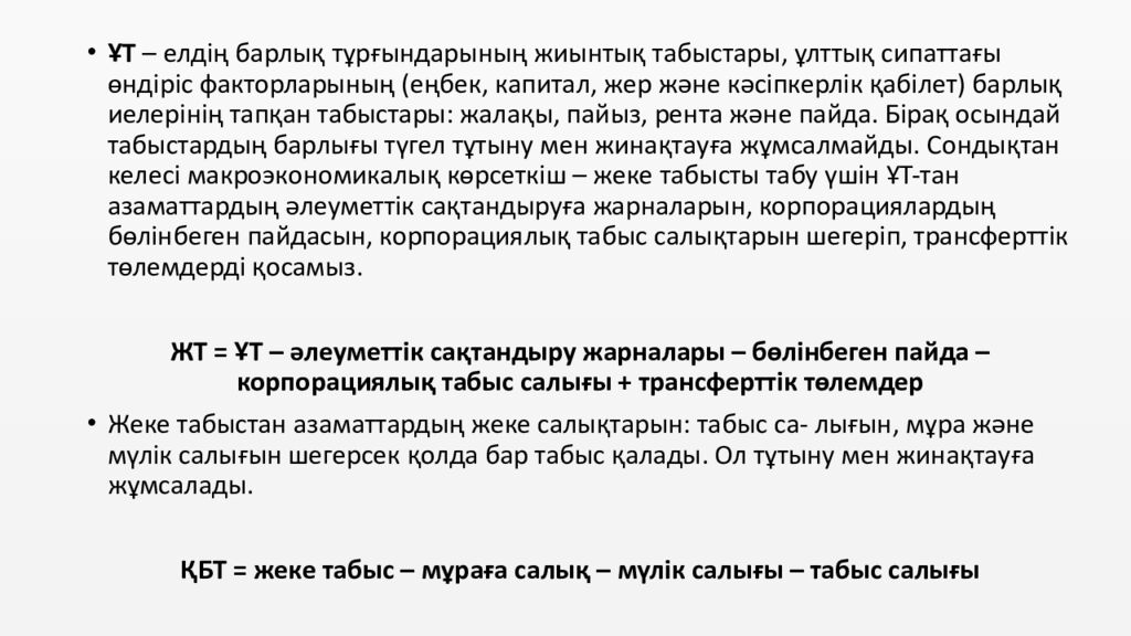 ҰТ – елдің барлық тұрғындарының жиынтық табыстары, ұлттық сипаттағы өндіріс факторларының (еңбек, капитал, жер жəне кəсіпкерлік қабілет) барлық иелерінің тапқан табыстары: жалақы, пайыз, рента жəне пайда. Бірақ осындай табыстардың барлығы түгел тұтыну мен жинақтауға жұмсалмайды. Сондықтан келесі макроэкономикалық көрсеткіш – жеке табысты табу үшін ҰТ-тан азаматтардың əлеуметтік сақтандыруға жарналарын, корпорациялардың бөлінбеген пайдасын, корпорациялық табыс салықтарын шегеріп, трансферттік төлемдерді қосамыз. ЖТ = ҰТ – əлеуметтік сақтандыру жарналары – бөлінбеген пайда – корпорациялық табыс салығы + трансферттік төлемдер Жеке табыстан азаматтардың жеке салықтарын: табыс са- лығын, мұра жəне мүлік салығын шегерсек қолда бар табыс қалады. Ол тұтыну мен жинақтауға жұмсалады. ҚБТ = жеке табыс – мұраға салық – мүлік салығы – табыс салығы
