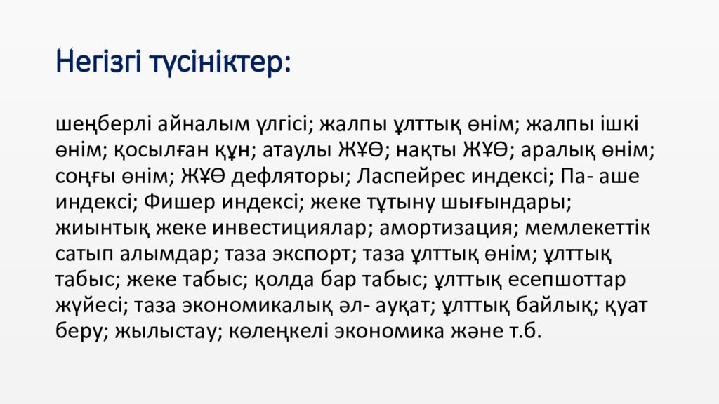 шеңберлі айналым үлгісі; жалпы ұлттық өнім; жалпы ішкі өнім; қосылған құн; атаулы ЖҰӨ; нақты ЖҰӨ; аралық өнім; соңғы өнім; ЖҰӨ дефляторы; Ласпейрес индексі; Па- аше индексі; Фишер индексі; жеке тұтыну шығындары; жиынтық жеке инвестициялар; амортизация; мемлекеттік сатып алымдар; таза экспорт; таза ұлттық өнім; ұлттық табыс; жеке табыс; қолда бар табыс; ұлттық есепшоттар жүйесі; таза экономикалық əл- ауқат; ұлттық байлық; қуат беру; жылыстау; көлеңкелі экономика жəне т.б.