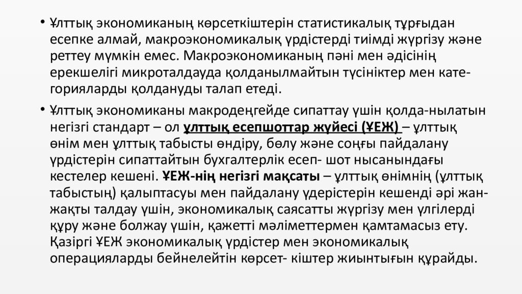 Ұлттық экономиканың көрсеткіштерін статистикалық тұрғыдан есепке алмай, макроэкономикалық үрдістерді тиімді жүргізу жəне реттеу мүмкін емес. Макроэкономиканың пəні мен əдісінің ерекшелігі микроталдауда қолданылмайтын түсініктер мен кате- горияларды қолдануды талап етеді. Ұлттық экономиканы макродеңгейде сипаттау үшін қолда-нылатын негізгі стандарт – ол ұлттық есепшоттар жүйесі (ҰЕЖ) – ұлттық өнім мен ұлттық табысты өндіру, бөлу жəне соңғы пайдалану үрдістерін сипаттайтын бухгалтерлік есеп- шот нысанындағы кестелер кешені. ҰЕЖ-нің негізгі мақсаты – ұлттық өнімнің (ұлттық табыстың) қалыптасуы мен пайдалану үдерістерін кешенді əрі жан-жақты талдау үшін, экономикалық саясатты жүргізу мен үлгілерді құру жəне болжау үшін, қажетті мəліметтермен қамтамасыз ету. Қазіргі ҰЕЖ экономикалық үрдістер мен экономикалық операцияларды бейнелейтін көрсет- кіштер жиынтығын құрайды.