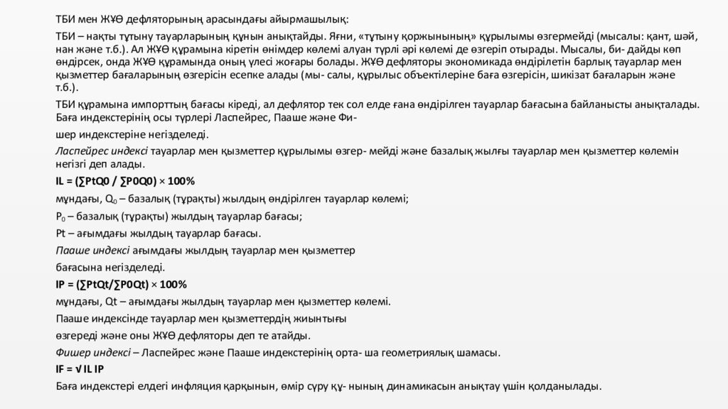 ТБИ мен ЖҰӨ дефляторының арасындағы айырмашылық: ТБИ – нақты тұтыну тауарларының құнын анықтайды. Яғни, «тұтыну қоржынының» құрылымы өзгермейді (мысалы: қант, шəй, нан жəне т.б.). Ал ЖҰӨ құрамына кіретін өнімдер көлемі алуан түрлі əрі көлемі де өзгеріп отырады. Мысалы, би- дайды көп өндірсек, онда ЖҰӨ құрамында оның үлесі жоғары болады. ЖҰӨ дефляторы экономикада өндірілетін барлық тауарлар мен қызметтер бағаларының өзгерісін есепке алады (мы- салы, құрылыс объектілеріне баға өзгерісін, шикізат бағаларын жəне т.б.). ТБИ құрамына импорттың бағасы кіреді, ал дефлятор тек сол елде ғана өндірілген тауарлар бағасына байланысты анықталады. Баға индекстерінің осы түрлері Ласпейрес, Пааше жəне Фи- шер индекстеріне негізделеді. Ласпейрес индексі тауарлар мен қызметтер құрылымы өзгер- мейді жəне базалық жылғы тауарлар мен қызметтер көлемін негізгі деп алады. IL = (∑PtQ0 / ∑P0Q0) × 100% мұндағы, Q 0 – базалық (тұрақты) жылдың өндірілген тауарлар көлемі; P 0 – базалық (тұрақты) жылдың тауарлар бағасы; Pt – ағымдағы жылдың тауарлар бағасы. Пааше индексі ағымдағы жылдың тауарлар мен қызметтер бағасына негізделеді. IР = (∑РtQt/∑P0Qt) × 100% мұндағы, Qt – ағымдағы жылдың тауарлар мен қызметтер көлемі. Пааше индексінде тауарлар мен қызметтердің жиынтығы өзгереді жəне оны ЖҰӨ дефляторы деп те атайды. Фишер индексі – Ласпейрес жəне Пааше индекстерінің орта- ша геометриялық шамасы. IF = √ IL IP Баға индекстері елдегі инфляция қарқынын, өмір сүру құ- нының динамикасын анықтау үшін қолданылады.