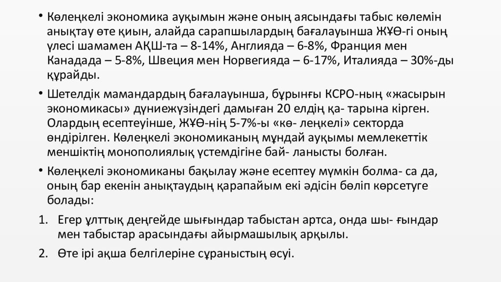 Көлеңкелі экономика ауқымын жəне оның аясындағы табыс көлемін анықтау өте қиын, алайда сарапшылардың бағалауынша ЖҰӨ-гі оның үлесі шамамен АҚШ-та – 8-14%, Англияда – 6-8%, Франция мен Канадада – 5-8%, Швеция мен Норвегияда – 6-17%, Италияда – 30%-ды құрайды. Шетелдік мамандардың бағалауынша, бұрынғы КСРО-ның «жасырын экономикасы» дүниежүзіндегі дамыған 20 елдің қа- тарына кірген. Олардың есептеуінше, ЖҰӨ-нің 5-7%-ы «кө- леңкелі» секторда өндірілген. Көлеңкелі экономиканың мұндай ауқымы мемлекеттік меншіктің монополиялық үстемдігіне бай- ланысты болған. Көлеңкелі экономиканы бақылау жəне есептеу мүмкін болма- са да, оның бар екенін анықтаудың қарапайым екі əдісін бөліп көрсетуге болады: Егер ұлттық деңгейде шығындар табыстан артса, онда шы- ғындар мен табыстар арасындағы айырмашылық арқылы. Өте ірі ақша белгілеріне сұраныстың өсуі.