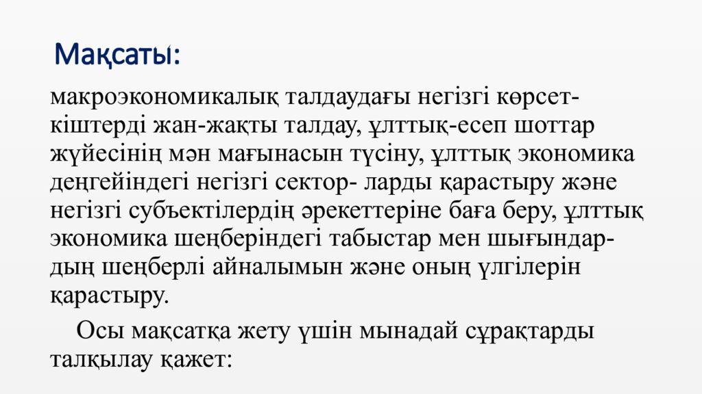 макроэкономикалық талдаудағы негізгі көрсет- кіштерді жан-жақты талдау, ұлттық-есеп шоттар жүйесінің мəн мағынасын түсіну, ұлттық экономика деңгейіндегі негізгі сектор- ларды қарастыру жəне негізгі субъектілердің əрекеттеріне баға беру, ұлттық экономика шеңберіндегі табыстар мен шығындар- дың шеңберлі айналымын жəне оның үлгілерін қарастыру. Осы мақсатқа жету үшін мынадай сұрақтарды талқылау қажет: