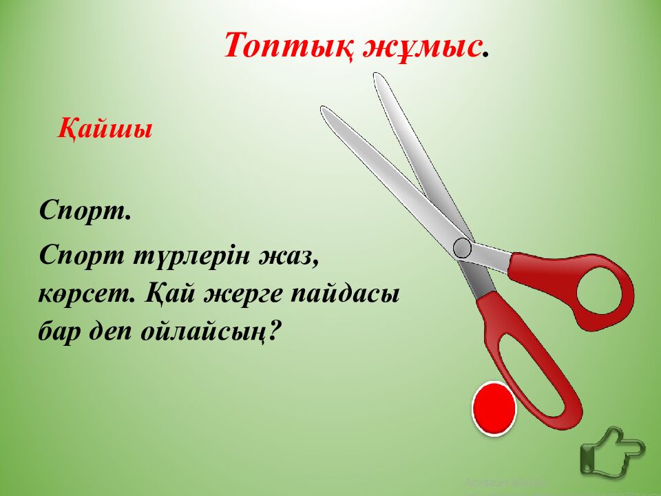 Қайшы Спорт. Спорт түрлерін жаз, көрсет. Қай жерге пайдасы бар деп ойлайсың? Топтық жұмыс.