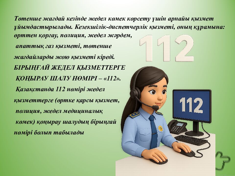 Төтенше жағдай кезінде жедел көмек көрсету үшін арнайы қызмет ұйымдастырылады. Кезекшілік-диспетчерлік қызметі, оның құрамына : өрттен қорғау, полиция, жедел жәрдем, апаттық газ қызметі, төтенше жағдайларды жою қызметі кіреді. БІРЫҢҒАЙ ЖЕДЕЛ ҚЫЗМЕТТЕРГЕ ҚОҢЫРАУ ШАЛУ НӨМІРІ – «112 ». Қазақстанда 112 нөмірі жедел қызметтерге ( өртке қарсы қызмет, полиция, жедел медициналық көмек ) қоңырау шалудың бірыңғай нөмірі болып табылады