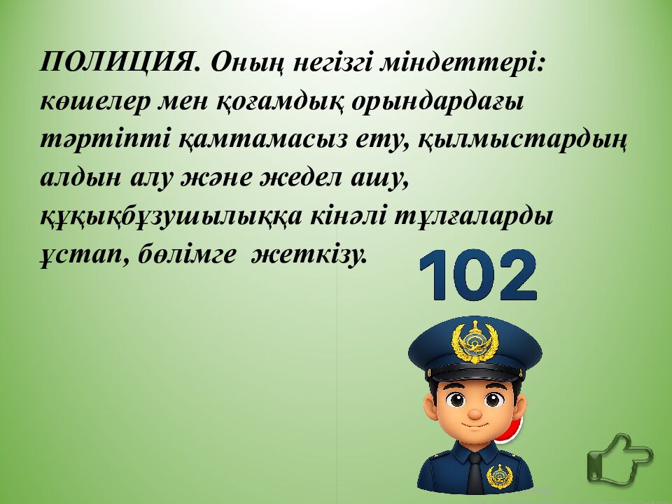 ПОЛИЦИЯ. Оның негізгі міндеттері : көшелер мен қоғамдық орындардағы тәртіпті қамтамасыз ету, қылмыстардың алдын алу және жедел ашу, құқықбұзушылыққа кінәлі тұлғаларды ұстап, бөлімге жеткізу.
