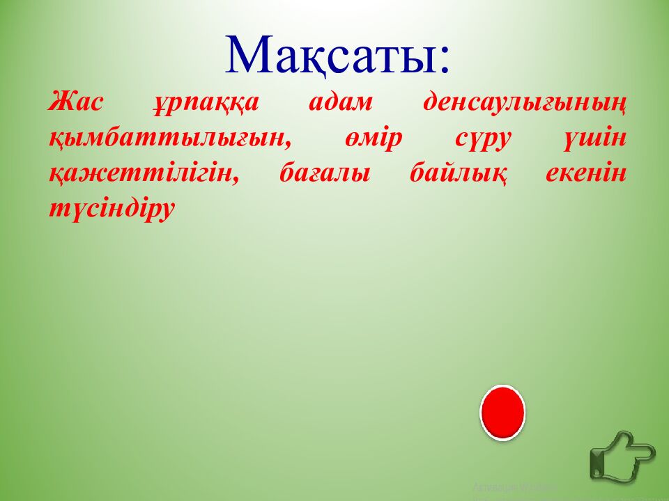 Мақсаты : Жас ұрпаққа адам денсаулығының қымбаттылығын, өмір сүру үшін қажеттілігін, бағалы байлық екенін түсіндіру
