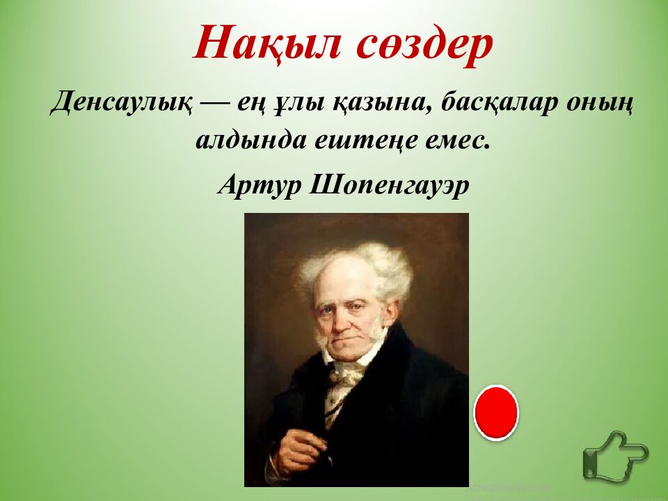 Нақыл сөздер Денсаулық — ең ұлы қазына, басқалар оның алдында ештеңе еме c. Артур Шопенгауэр