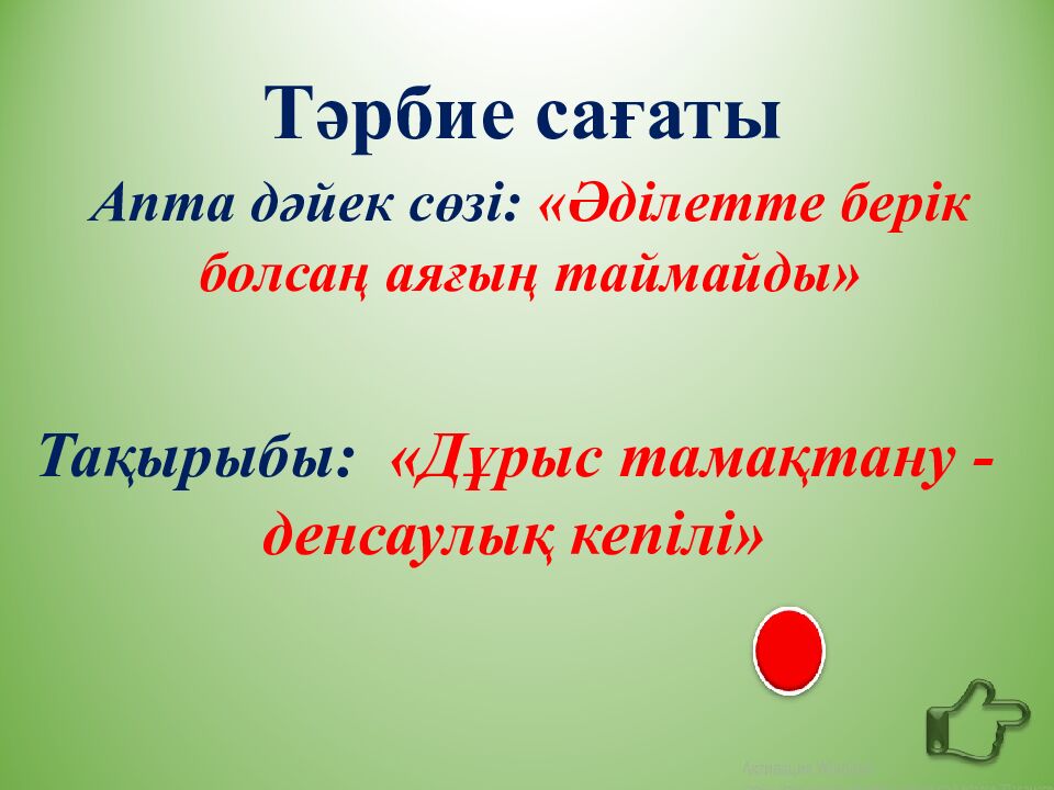 Тәрбие сағаты Тақырыбы : « Дұрыс тамақтану -денсаулық кепілі» Апта дәйек сөзі: «Әділетте берік болсаң аяғың таймайды»