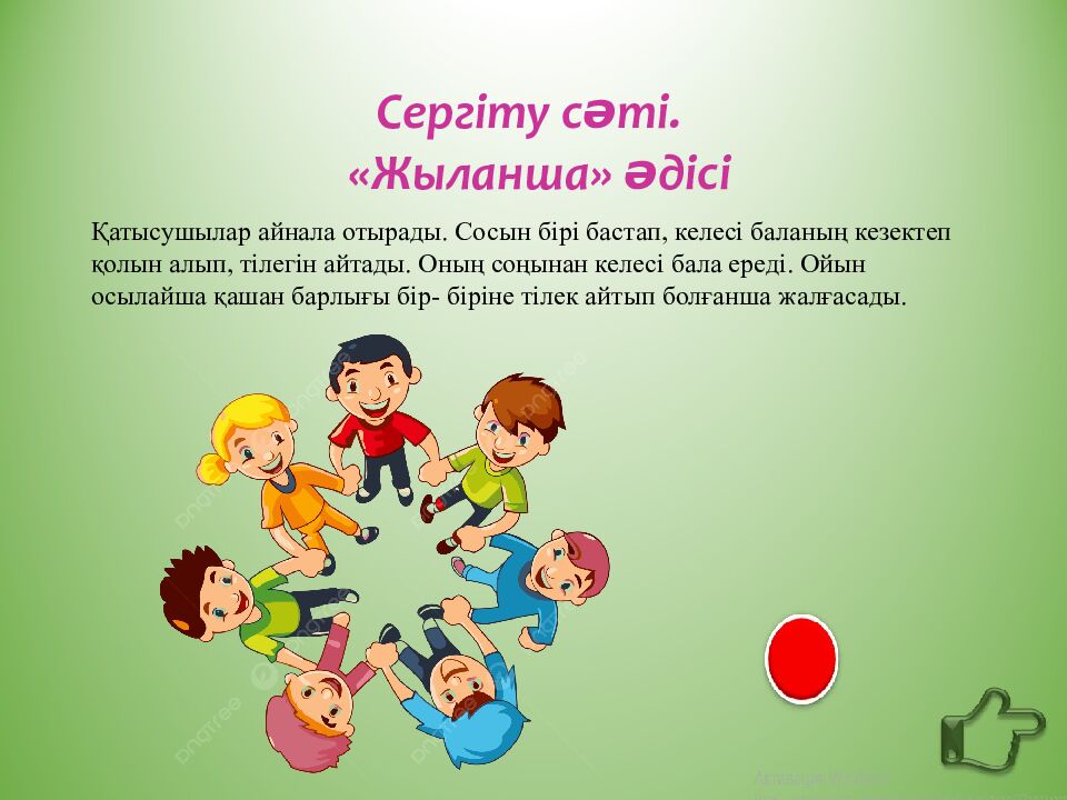 Қатысушылар айнала отырады. Сосын бірі бастап, келесі баланың кезектеп қолын алып, тілегін айтады. Оның соңынан келесі бала ереді. Ойын осылайша қашан барлығы бір- біріне тілек айтып болғанша жалғасады.