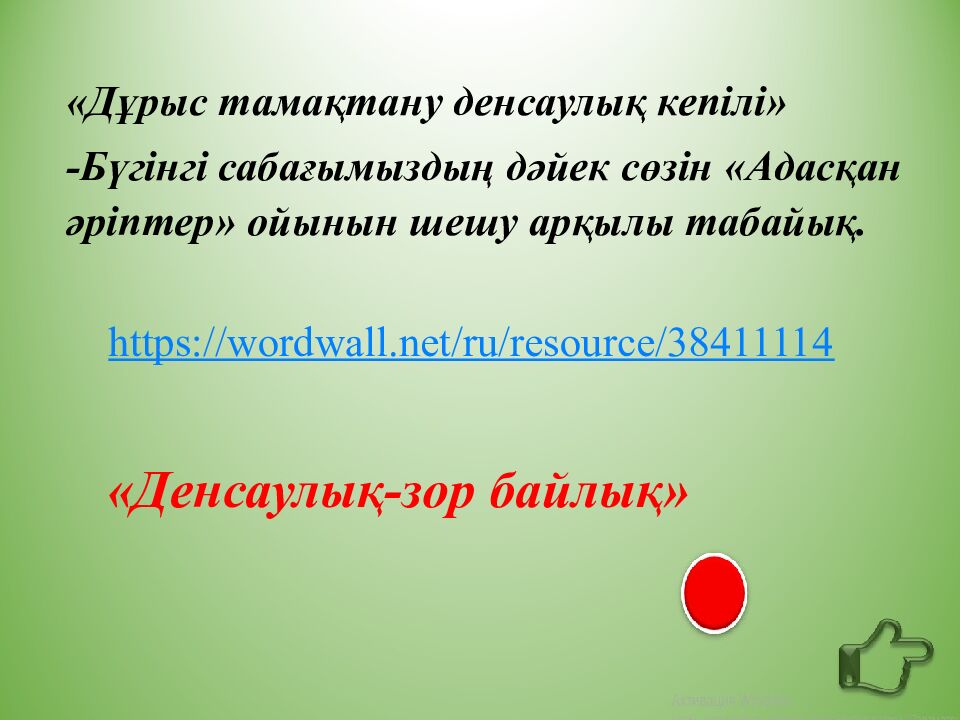 «Дұрыс тамақтану денсаулық кепілі» -Бүгінгі сабағымыздың дәйек сөзін «Адасқан әріптер» ойынын шешу арқылы табайық. « Денсаулық-зор байлық » https://wordwall.net/ru/resource/38411114