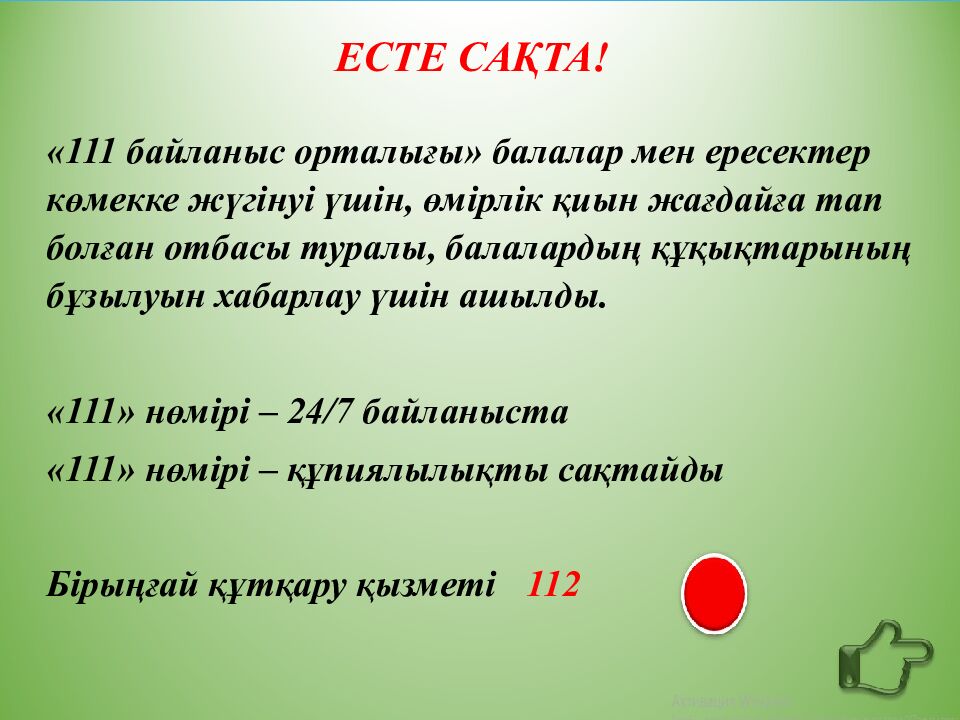 ЕСТЕ САҚТА! « 111 байланыс орталығы» балалар мен ересектер көмекке жүгінуі үшін, өмірлік қиын жағдайға тап болған отбасы туралы, балалардың құқықтарының бұзылуын хабарлау үшін ашылды. «111» нөмірі – 24/7 байланыста «111» нөмірі – құпиялылықты сақтайды Бірыңғай құтқару қызметі 112