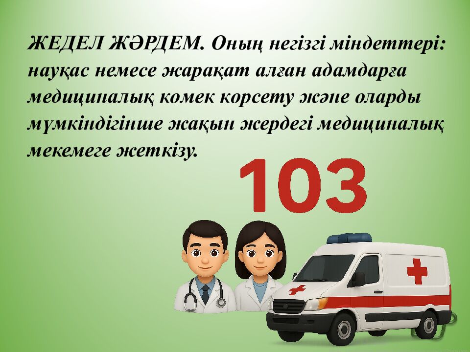 ЖЕДЕЛ ЖӘРДЕМ. Оның негізгі міндеттері : науқас немесе жарақат алған адамдарға медициналық көмек көрсету және оларды мүмкіндігінше жақын жердегі медициналық мекемеге жеткізу.