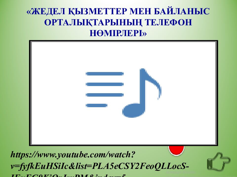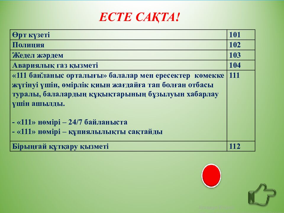 ЕСТЕ САҚТА! Өрт күзеті 101 Полиция 102 Жедел жәрдем 103 Авариялық газ қызметі 104 «111 баи ̆ ланыс орталығы » балалар мен ересектер көмекке жүгінуі үшін, өмірлік қиын жағдайға тап болған отбасы туралы, балалардың құқықтарының бұзылуын хабарлау үшін ашылды. - «111» нөмірі – 24/7 байланыста - «111» нөмірі – құпиялылықты сақтайды 111 Бірыңғай құтқару қызметі 112