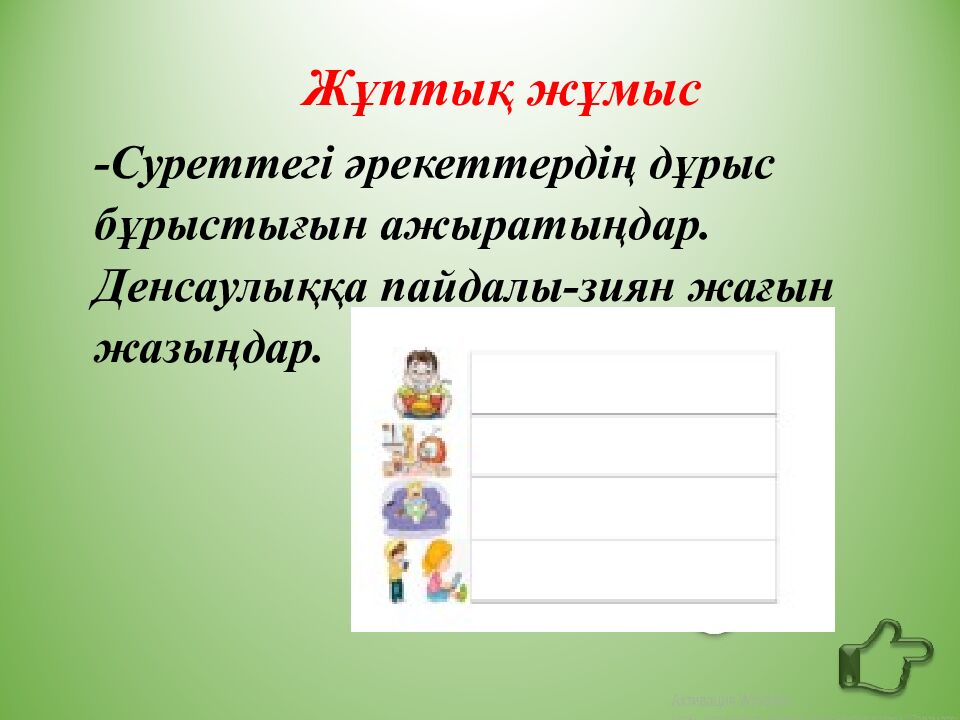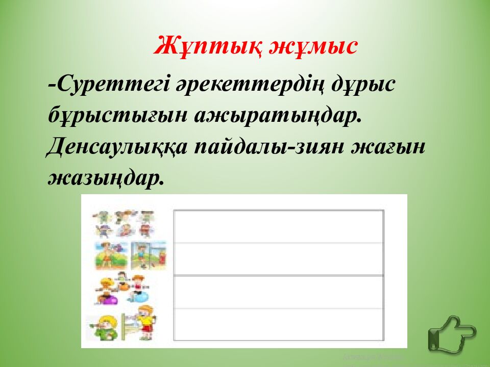 Жұптық жұмыс -Суреттегі әрекеттердің дұрыс бұрыстығын ажыратыңдар. Денсаулыққа пайдалы-зиян жағын жазыңдар.