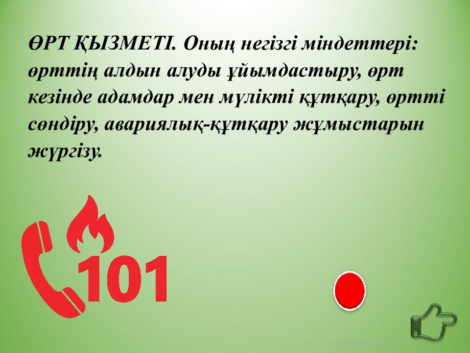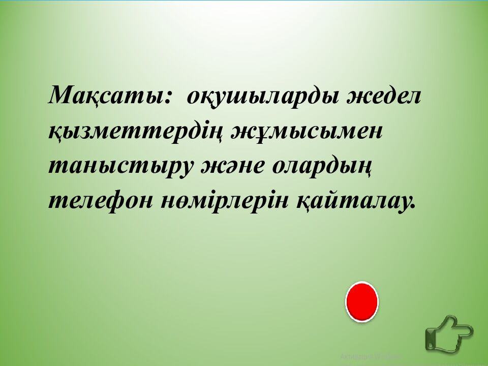 Мақсаты : оқушыларды жедел қызметтердің жұмысымен таныстыру және олардың телефон нөмірлерін қайталау.