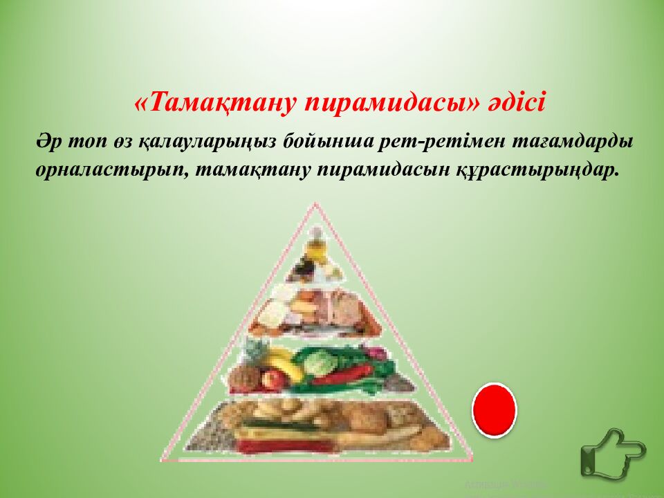 «Тамақтану пирамидасы» әдісі Әр топ өз қалауларыңыз бойынша рет-ретімен тағамдарды орналастырып, тамақтану пирамидасын құрастырыңдар.