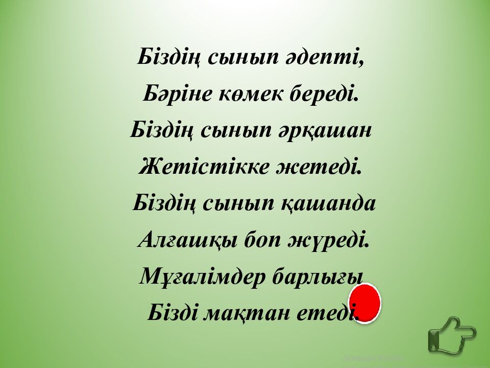 Біздің сынып әдепті, Бәріне көмек береді. Біздің сынып әрқашан Жетістікке жетеді. Біздің сынып қашанда Алғашқы боп жүреді. Мұғалімдер барлығы Бізді мақтан етеді.