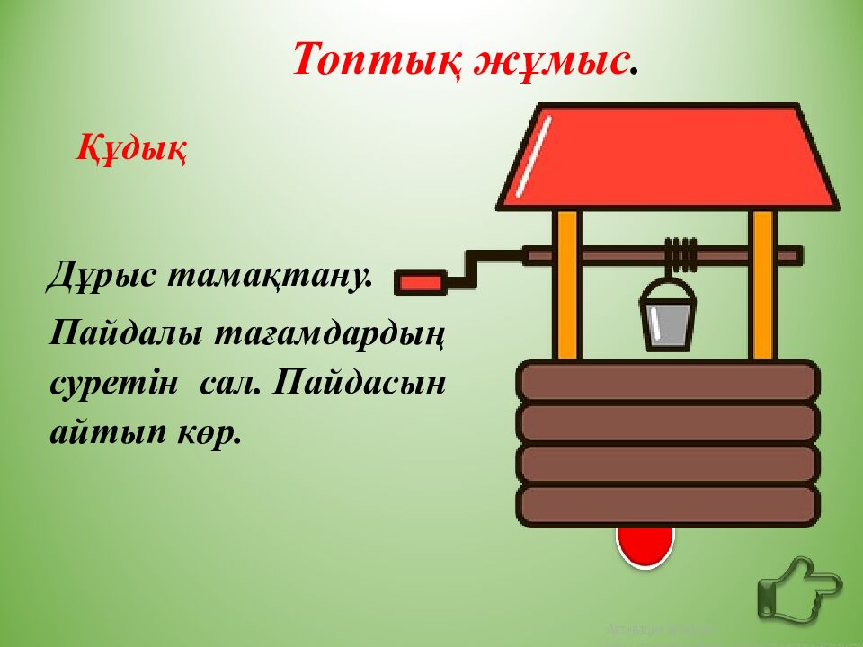 Құдық Дұрыс тамақтану. Пайдалы тағамдардың суретін сал. Пайдасын айтып көр. Топтық жұмыс.