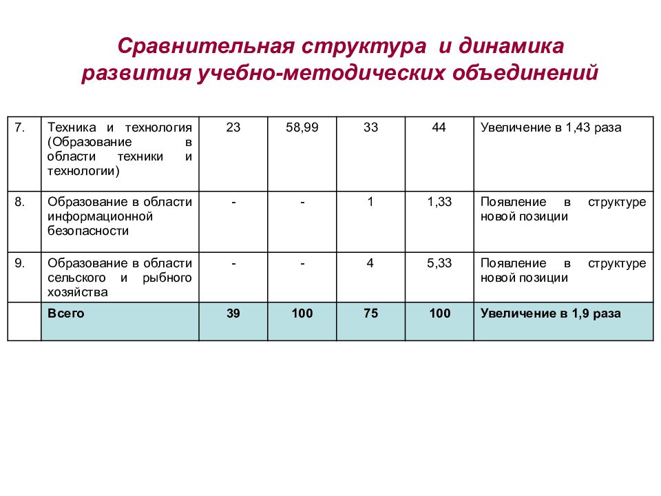 Слайд 9: Сравнительная структура и динамика развития учебно-методических объединений