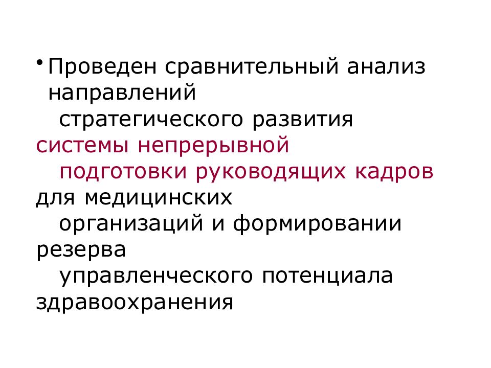 Проведен сравнительный анализ направлений стратегического развития системы непрерывной подготовки руководящих кадров для медицинских организаций и формировании резерва управленческого потенциала здравоохранения