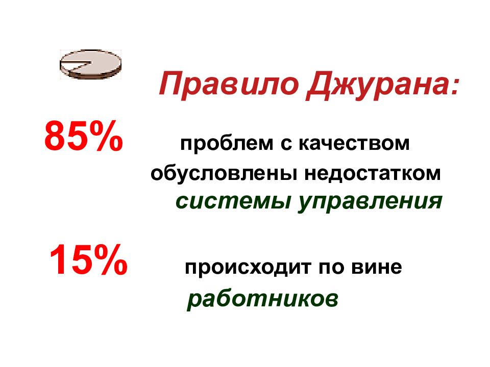 Правило Джурана : 85% проблем с качеством обусловлены недостатком системы управления 15% происходит по вине работников