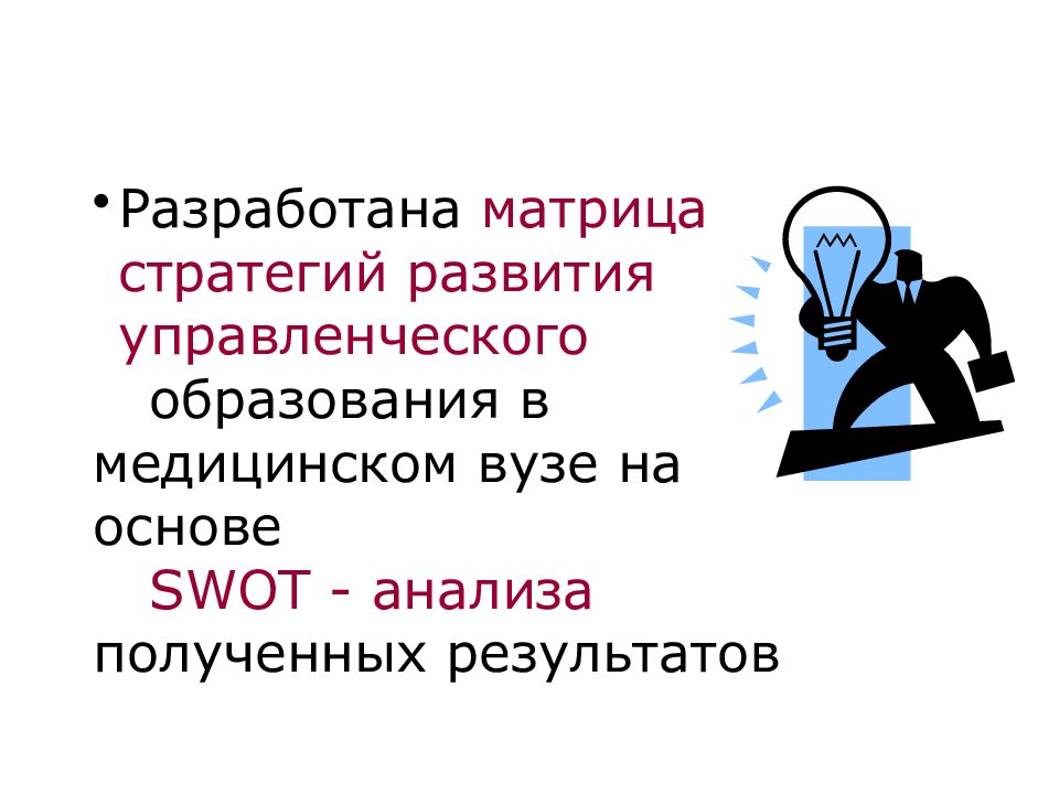 Разработана матрица стратегий развития управленческого образования в медицинском вузе на основе SWOT - анализа полученных результатов