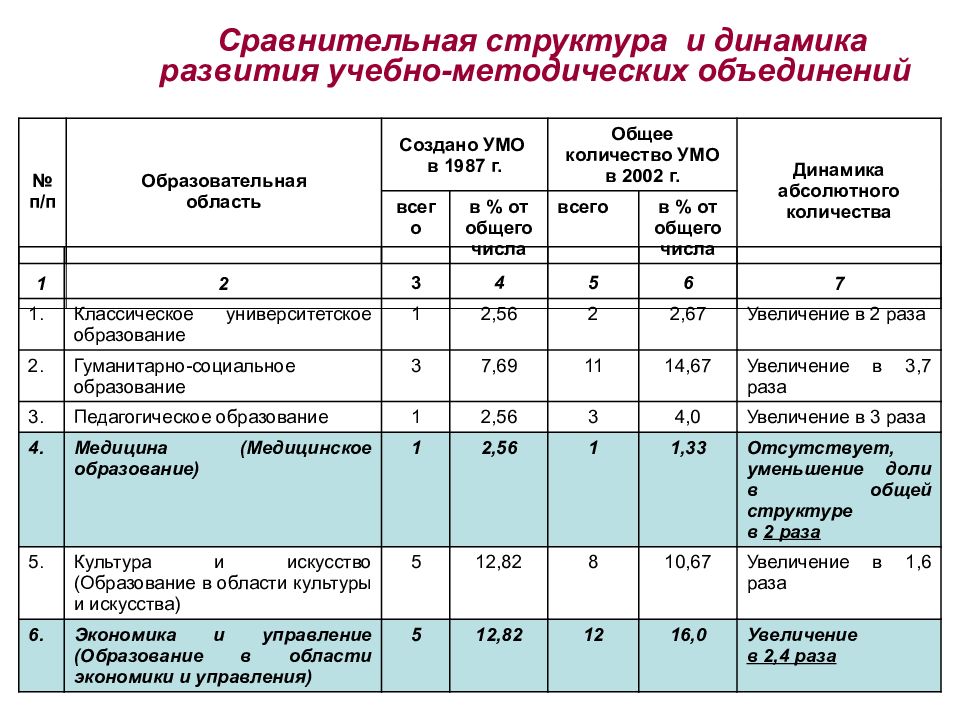 № п/п Образовательная область Создано УМО в 1987 г. Общее количество УМО в 2002 г. Динамика абсолютного количества всего в % от общего числа всего в % от общего числа 1 2 3 4 5 6 7 1. Классическое университетское образование 1 2,56 2 2,67 Увеличение в 2 раза 2. Гуманитарно-социальное образование 3 7,69 11 14,67 Увеличение в 3,7 раза 3. Педагогическое образование 1 2,56 3 4,0 Увеличение в 3 раза 4. Медицина (Медицинское образование) 1 2,56 1 1,33 Отсутствует, уменьшение доли в общей структуре в 2 раза 5. Культура и искусство (Образование в области культуры и искусства) 5 12,82 8 10,67 Увеличение в 1,6 раза 6. Экономика и управление (Образование в области экономики и управления) 5 12,82 12 16,0 Увеличение в 2,4 раза
