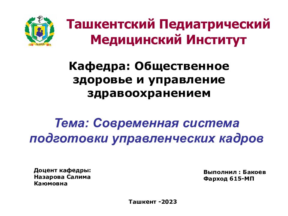 Ташкентский Педиатрический Медицинский Институт Тема: Современная система подготовки управленческих кадров Ташкент -2023 Кафедра: Общественное здоровье и управление здравоохранением Выполнил : Бакоев Фарход 615-МП Доцент кафедры: Назарова Салима Каюмовна
