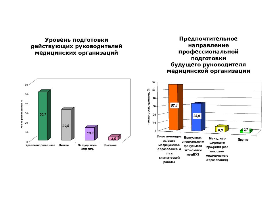 Уровень подготовки действующих руководителей медицинских организаций Предпочтительное направление профессиональной подготовки будущего руководителя медицинской организации
