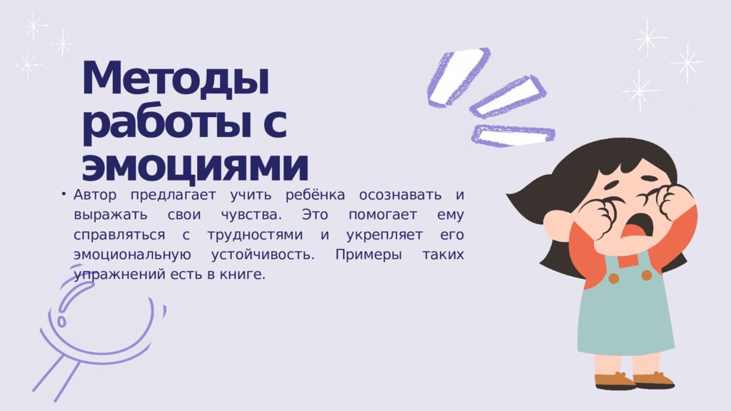 Методы работы с эмоциями Автор предлагает учить ребёнка осознавать и выражать свои чувства. Это помогает ему справляться с трудностями и укрепляет его эмоциональную устойчивость. Примеры таких упражнений есть в книге.