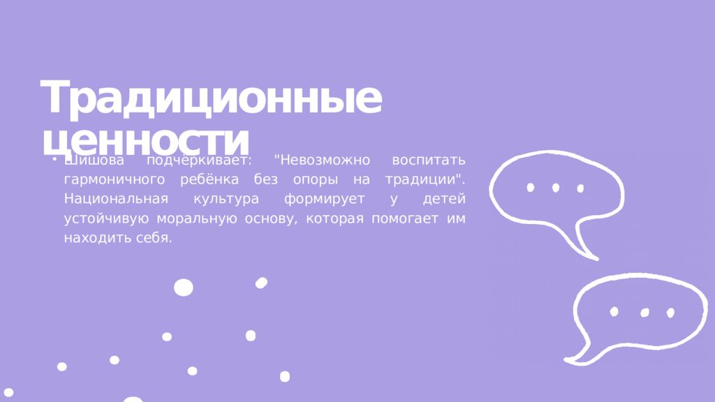 Шишова подчёркивает: "Невозможно воспитать гармоничного ребёнка без опоры на традиции". Национальная культура формирует у детей устойчивую моральную основу, которая помогает им находить себя. Традиционные ценности