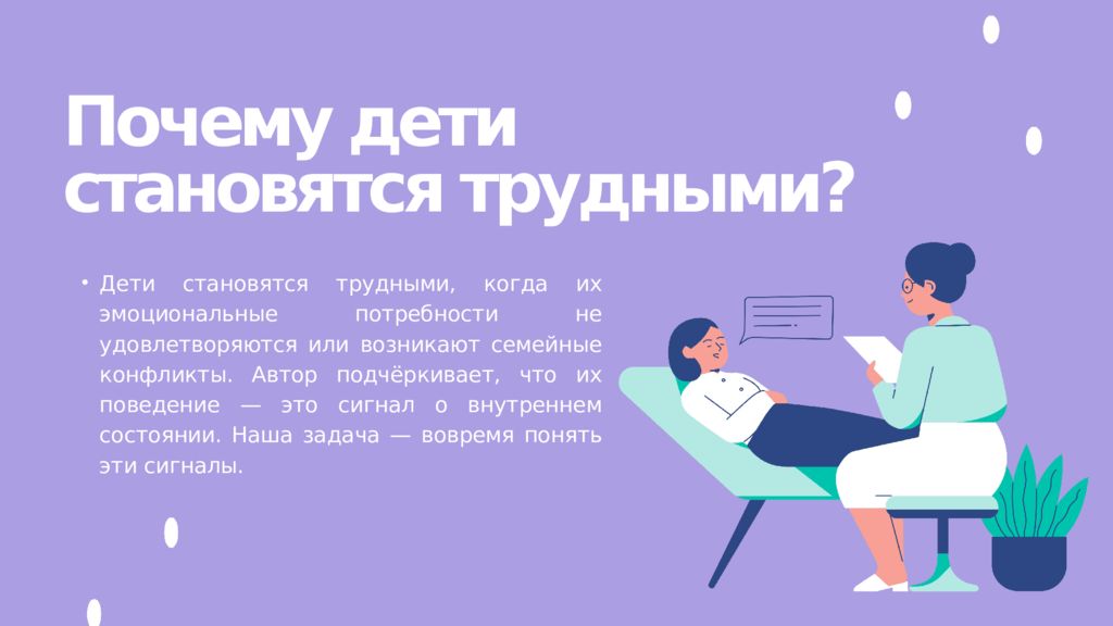 Почему дети становятся трудными? Дети становятся трудными, когда их эмоциональные потребности не удовлетворяются или возникают семейные конфликты. Автор подчёркивает, что их поведение — это сигнал о внутреннем состоянии. Наша задача — вовремя понять эти сигналы.